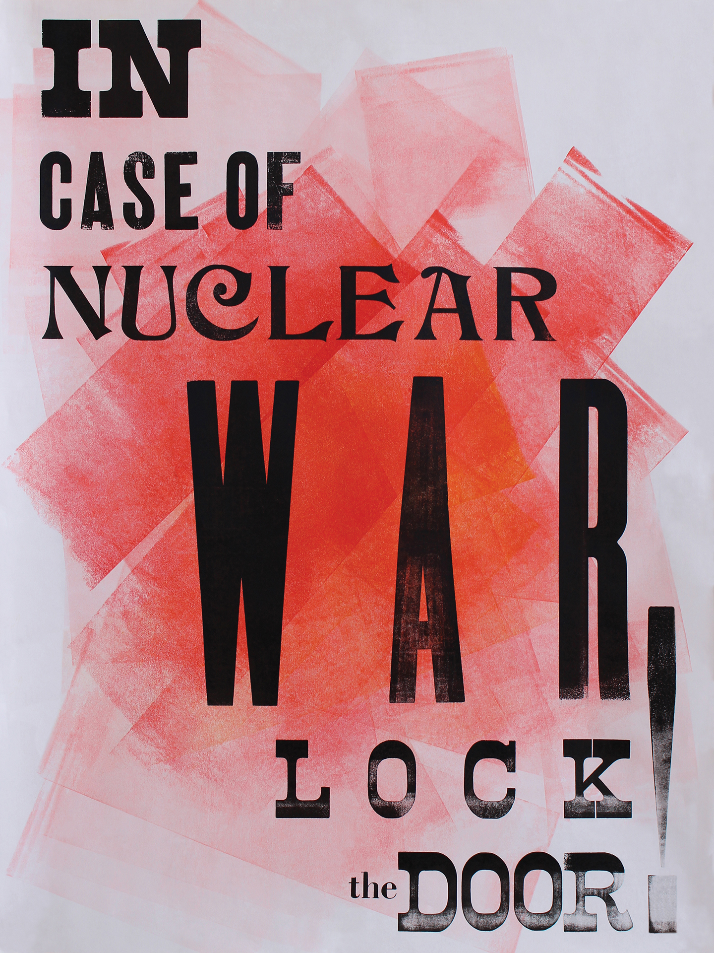 “The red background was made using a small hand ink roller and represents my fear of atomic explosion,” he said. “In contrast to this loud background, the word ‘nuclear’ uses the 1960’s ‘hippie style’ of typography.”